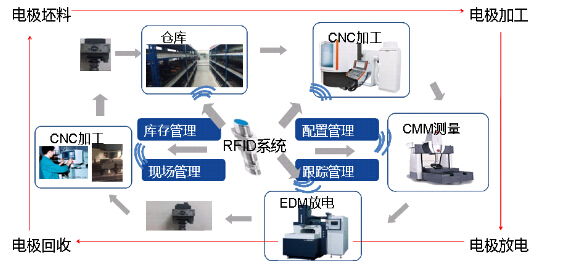 解決方案:對(duì)每個(gè)電極治具上安裝RFID電子芯片,對(duì)電極的設(shè)計(jì)延伸到制造、測(cè)量和使用的全過程中實(shí)現(xiàn)數(shù)據(jù)和制造無縫交互,實(shí)現(xiàn)全流程的自動(dòng)化,無人化。