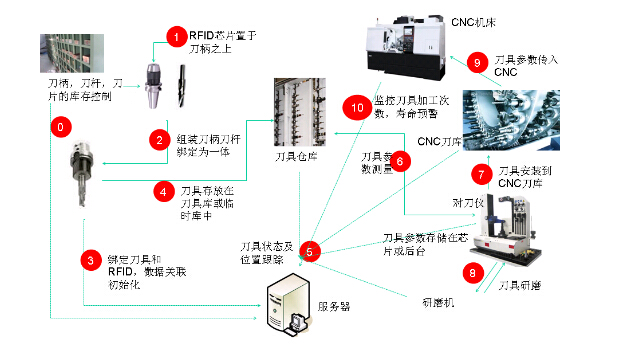 解決方案:在刀柄上安裝RFID標(biāo)簽,實(shí)現(xiàn)對(duì)刀具的自動(dòng)辨識(shí),并自動(dòng)調(diào)用刀補(bǔ)參數(shù),以及對(duì)應(yīng)的加工程序,實(shí)現(xiàn)從工件裝夾到完成所有加工工序的智能化,并實(shí)現(xiàn)對(duì)刀具的全生命周期跟蹤與管控。