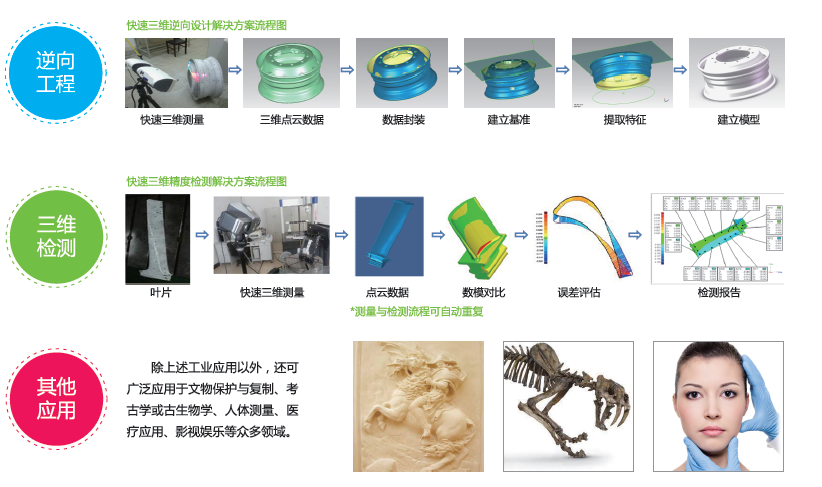 面掃描三維測量技術(shù)是一種集光學(xué)、機械、計算機視覺、攝影測量和軟件工程于一體的新型三維測量技術(shù)。面向高端制造業(yè)和傳統(tǒng)制造企業(yè)的需求,開展各類產(chǎn)品的設(shè)計、制造、檢測等技術(shù)支持。